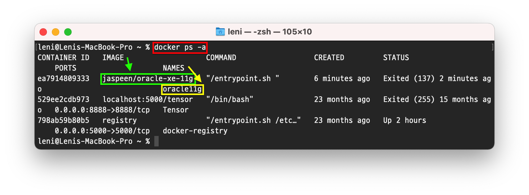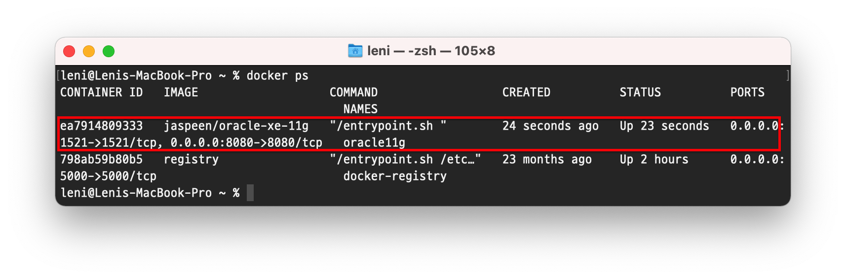 ํฐ๋ฏธ๋ ์ฐฝ์ ์์ผ๋ก ๊ธธ๊ฒ ๋๋ฆฌ๋ฉด IMAGE ์นผ๋ผ์ ~/oracle-xe-11g NAME ์นผ๋ผ์ oracle11g( ๋ณธ์ธ์ด ์ค์ ํ ์ด๋ฆ )์ด ๋ฌ๋ค.