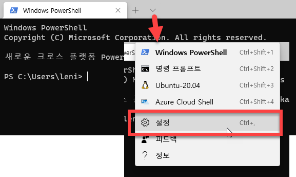 - Terminal์์ ์ค์ ์ฐฝ(Setting.json)์ ์ด์ด์ค๋๋ค.