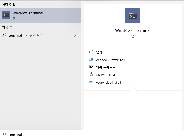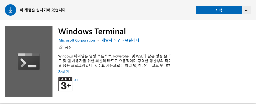 - WSL๋ฅผ ๋ค์ด ๋ฐ์๋ Microsoft Store์์ Windows Terminal๋ฅผ ๊ฒ์ํ์ฌ ์ค์นํฉ๋๋ค.