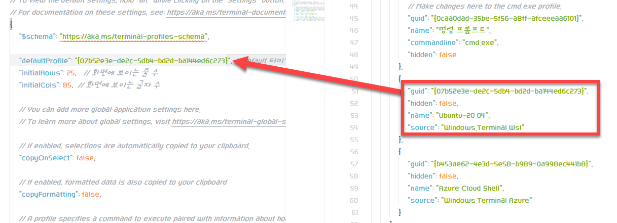 - defaultProfile ๋ถ๋ถ์ default๋ก ์ค์ ํ๊ณ ์ถ์ ํฐ๋ฏธ๋์ guid๋ก ์