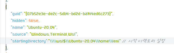 "startingDirectory":"\\\\wsl$\\์ค์น๋Ubuntu์ด๋ฆ\\home\\์ฌ์ฉ์์ด๋ฆ"