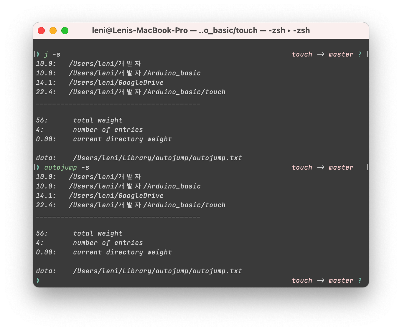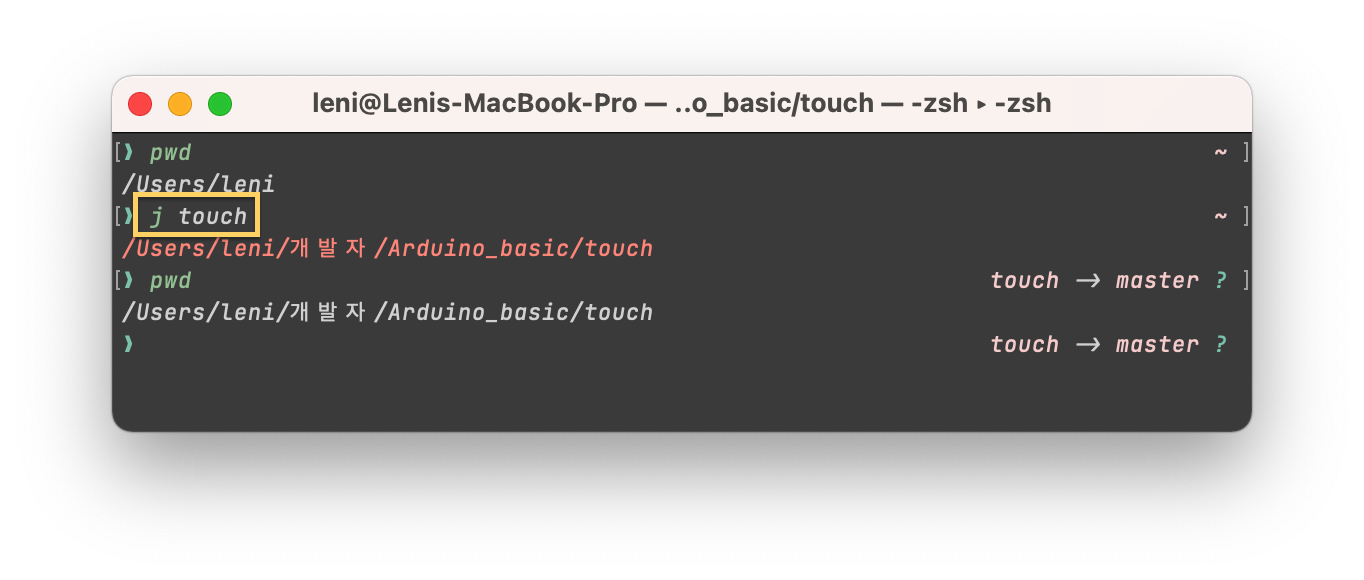 ์๋ฅผ ๋ค์ด ๋ด๊ฐ /Users/leni/๊ฐ๋ฐ์/Arduino_basic/touch ์ ํ ๋ฒ์ด๋ผ๋ ๋ค๋ ์จ ์ ์ด ์์ ๋ ํ๋๋ ํ ๋ฆฌ์์ j touch๋ง ์ ์ผ๋ฉด ๋ฐ๋ก ์ด๋์ด ๊ฐ๋ฅํ๋ค!