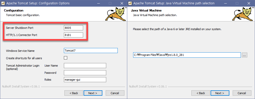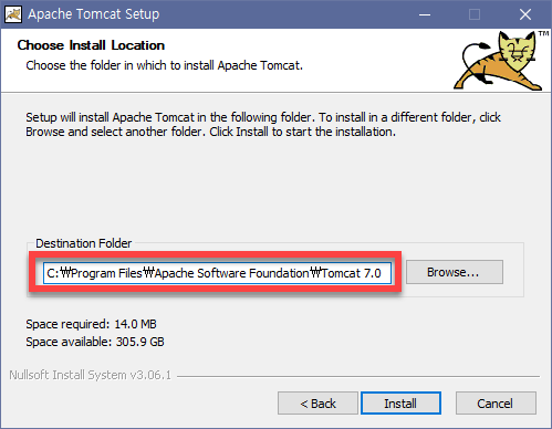 ํด๋ ์์น(๋นจ๊ฐ์ ๋ฐ์ค)๋ฅผ ๊ฐ๋จํ๊ฒ C:\Tomcat 7.0์ผ๋ก ๋ณ๊ฒฝํ๊ณ Install์ ํด์ฃผ์!