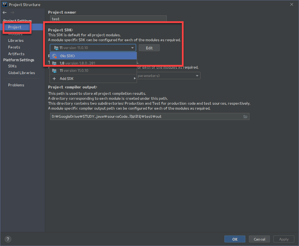 ์๊น ์ด์๋ Project Structure ์ฐฝ์ ์ด๊ณ Project ๋ฅผ ํด๋ฆญํ๊ณ Project SDK๋ฅผ ๋ณ๊ฒฝํด์ฃผ๋ฉด ๋!