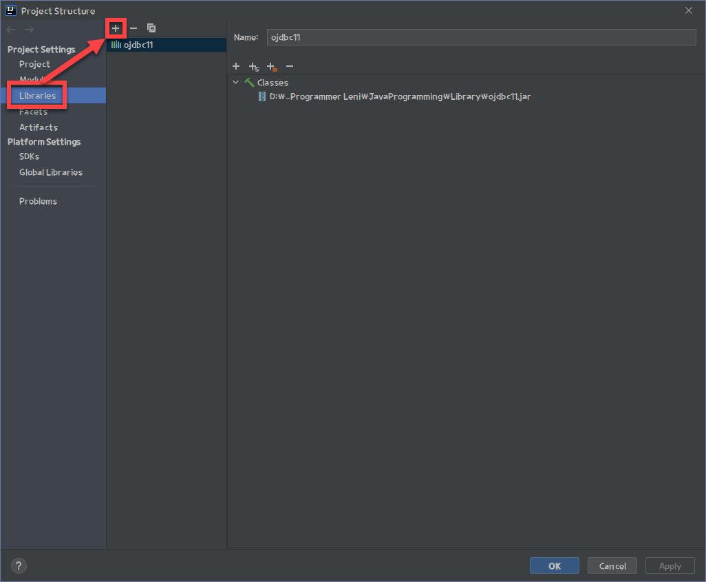 ์ฐฝ์ด ๋จ๋ฉด ์ข์ธก์ ์๋ Libraries๋ฅผ ํด๋ฆญํด์ฃผ๊ณ , ์๋จ โ ๋ฒํผ์ ์ฌ์ฉํ์ฌ .jar ํ์ผ์ ์ถ๊ฐ( ๊ฒฝ๋ก ๋ฐ๋ผ์ ์ฐพ์์ ๋ฃ์ด์ฃผ๋ฉด ๋๊ฒ ๋ค )ํด์ค๋ค!