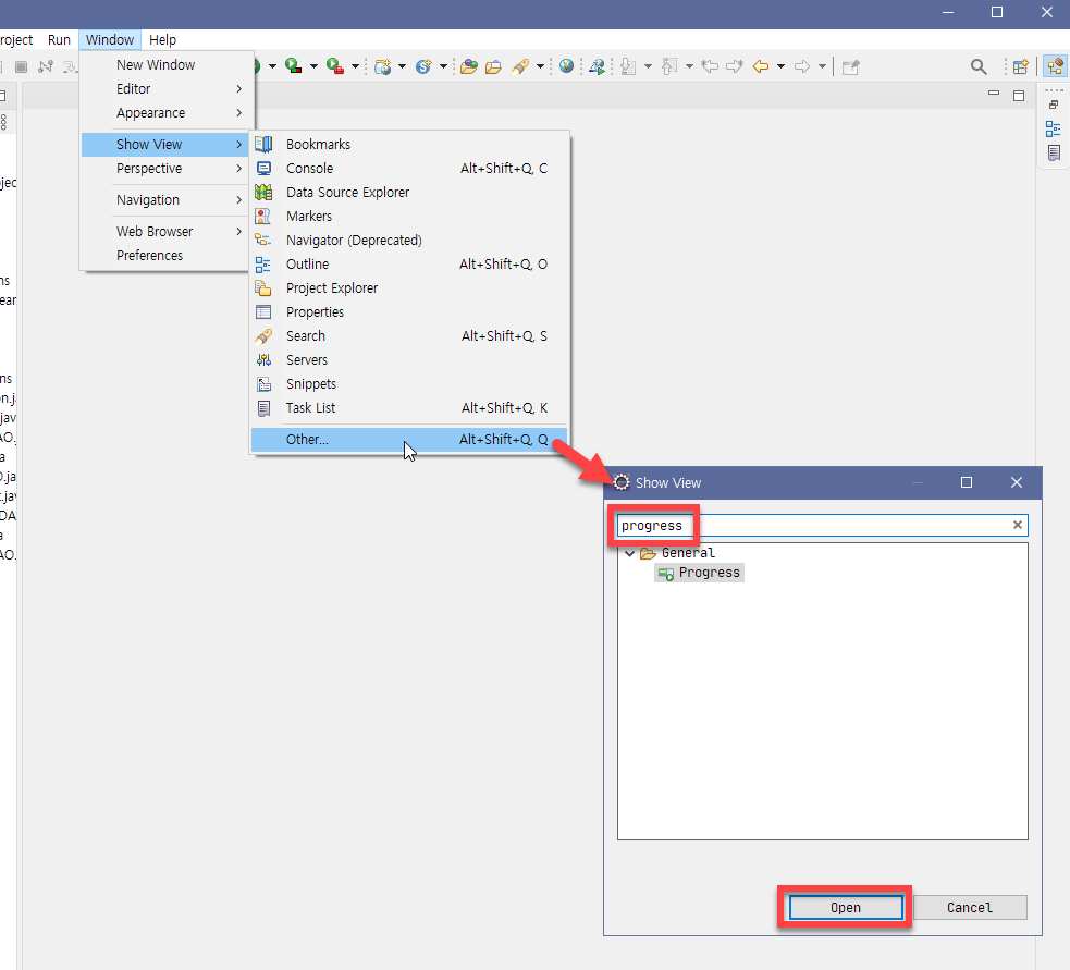μλ¨ λ©λ΄μ Window > Show View > Other λ₯Ό λλ₯΄κ³ , progress λ₯Ό κ²μν΄μ open νλ©΄ μλ λ©λ΄μ μκΈ΄λ€!