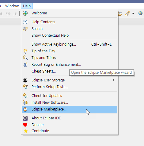 1. μλ¨ λ©λ΄ Help > Eclipse Marketplace... λ₯Ό μ΄μ΄μ£ΌμΈμ!