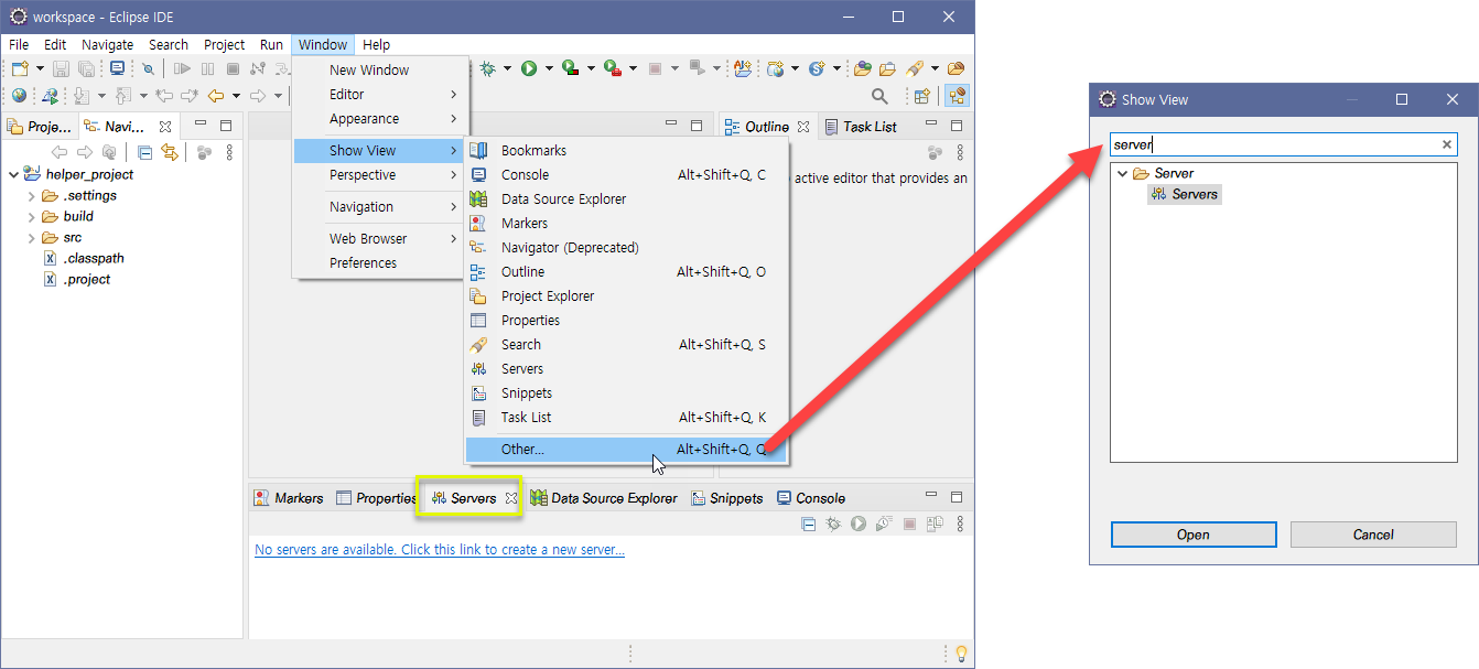 μ΄ν΄λ¦½μ€ μλ¨ λ©λ΄ Window > Show View > Other... λ₯Ό ν΄λ¦νμ¬ server νμ κ²μν΄μ Open ν΄μ£Όμ.