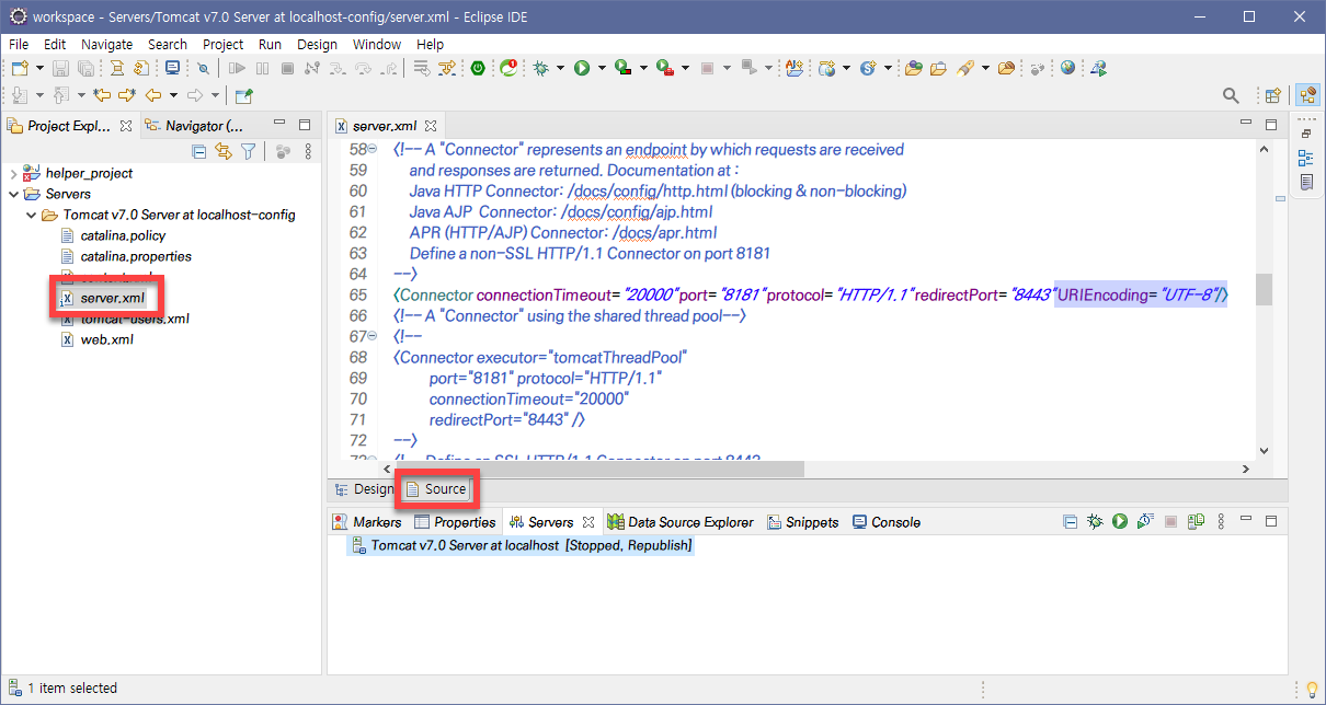 server.xml νμΌμ Source ννλ‘ μ΄κ³ Connector λΆλΆμ μ°Ύμμ λ€μ μ΅μ μ μΆκ°ν΄μ£Όμ.