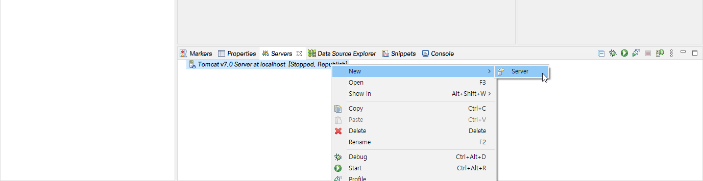 μμ± λμ΄ μλ μλ²λ₯Ό μ°ν΄λ¦νμ¬ New > Server λ₯Ό λλ¬μ μλ² μμ± μ°½μ μ΄μ΄μ μμ±νλ©΄ λλ€!