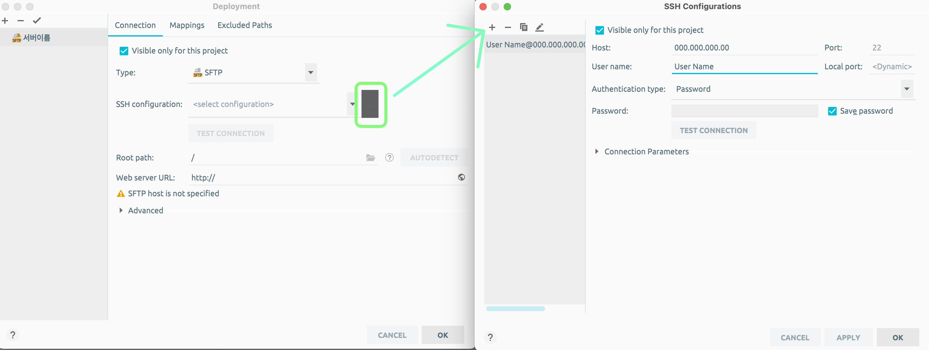 - ์ฐฝ์ด ์ด๋ฆฌ๋ฉด + ๋ฒํผ์ ํด๋ฆญํ์ฌ ์ ์ํ Host์ SSH ์ ๋ณด๋ฅผ ์ ๋ ฅ ํด์ค๋ค.