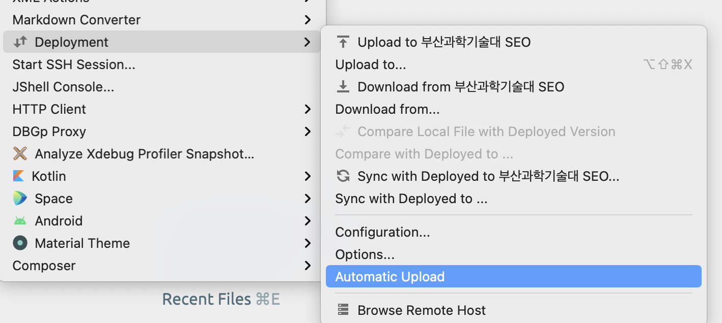 - Intelli J ์๋จ Tools > Deployment > Automatic Upload ๋ฅผ ํตํด์ ์์ ํด๋ ๋ด ๋ณ๊ฒฝ์ด ์ผ์ด๋๋ ์ฆ์ ์ฝ๋๋ฅผ ์๋ฒ์ ์ ๋ก๋ ํ ์ ์๋ค.