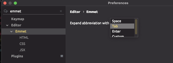 Preferences > Editor > Emmet μ νμΈν΄λ³΄μ.