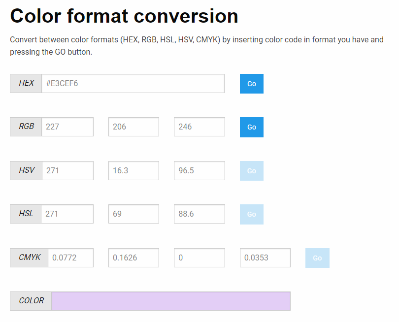 ๋ง์ฝ ๊ทธ ์ธ์ RGB, HSV, HSL, CMYK๊ฐ ์๊ณ ์ถ๋ค ๊ฑฐ๋ ์์์ ๋ํ HEX ๋๋ RGB ๊ฐ์ ์๊ณ ์๋๋ฐ ๋ค๋ฅธ ๋จ์๋ก ๋ณํํ๊ณ ์ถ๋ค.