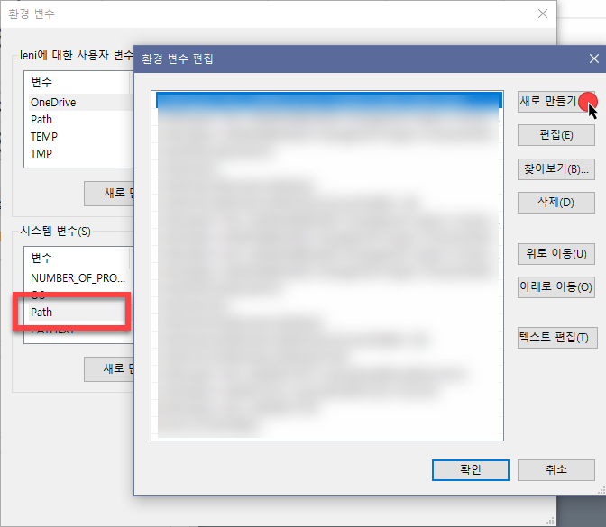 2. ํ๊ฒฝ ๋ณ์ ํธ์ง ์ฐฝ์ด ์ด๋ฆฌ๋ฉด ์ฐ์ธก ์๋จ์ ์๋ก ๋ง๋ค๊ธฐ๋ฅผ ํด๋ฆญํ์ฌ ๊ฒฝ๋ก๋ฅผ ์ถ๊ฐํ๋ค!