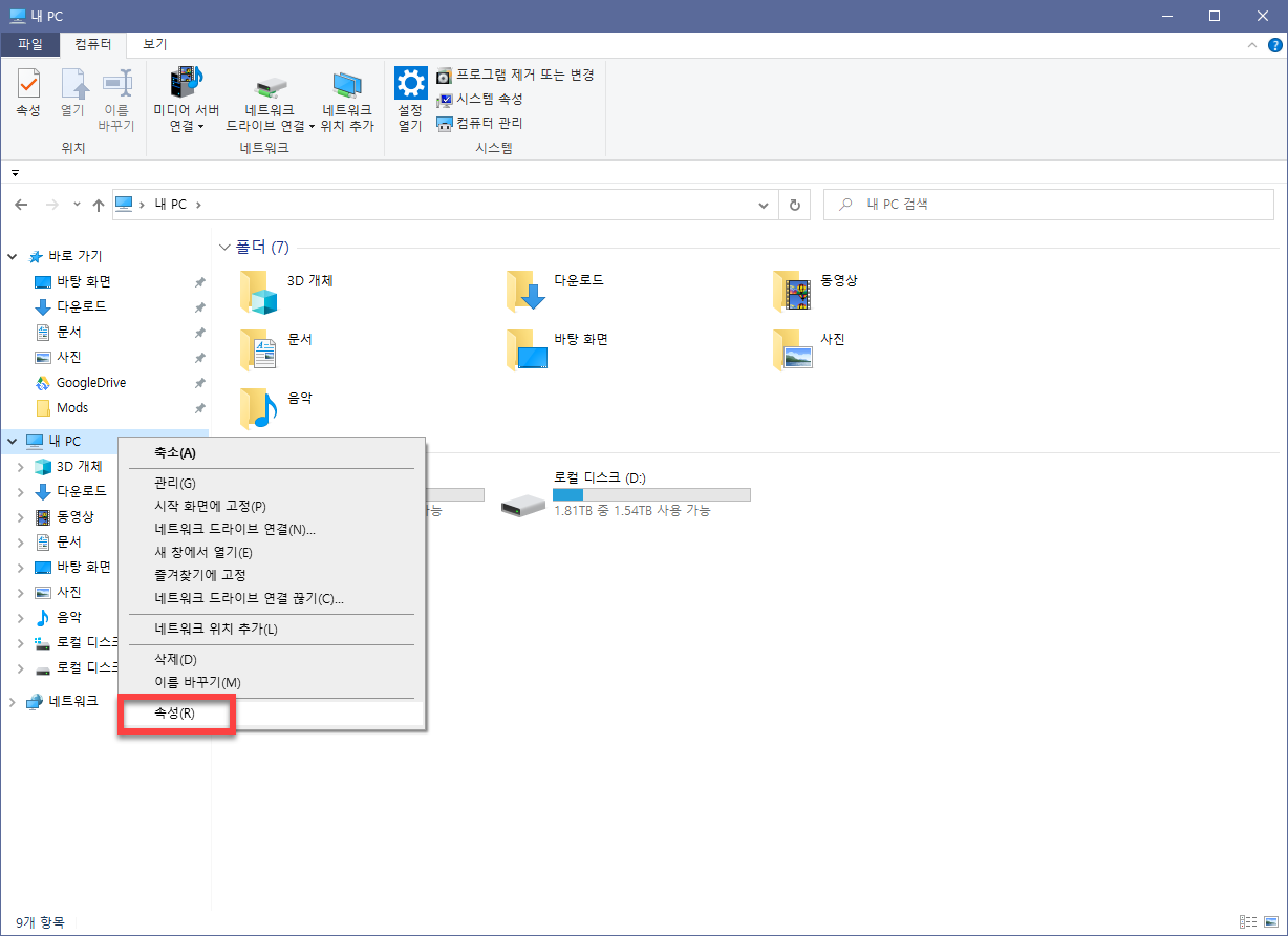 2. ์ข์ธก ๋ฉ๋ด์ ๋ด PC๋ฅผ ์ฐพ๊ณ ์ฐํด๋ฆญ > ์์ฑ์ ๋๋ฆฐ๋ค.