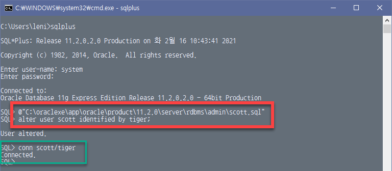 3. cmd ์ฐฝ์ ์ด๊ณ sqlplus๋ฅผ ์คํ ํ scott์ ์ฐ๊ฒฐํ์