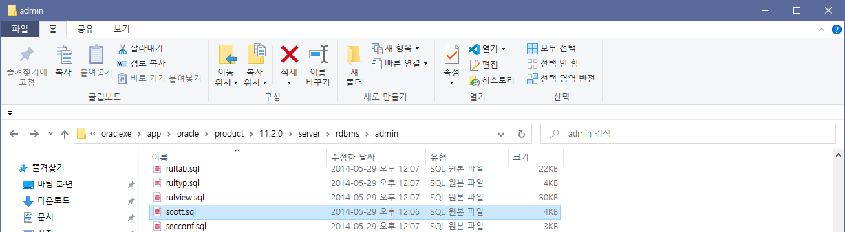 2. ๋ค์ ๊ฒฝ๋ก๋ก ์ด๋ํ์ฌ s๋ฅผ ๋๋ฌ scott.sql์ ์ฐพ์